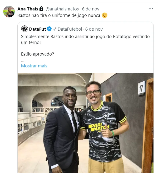 “Bastos não tira o uniforme de jogo nunca”, comentou Ana Thaís, aproveitando o termo “joga de terno”, usado por analistas esportivos e torcedores para definir um atleta que tem boas atuações e demonstra elegância dentro de campo.