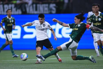 Gustavo Gomez, do Palmeiras, disputa jogada com Almada, do Botafogo, em partida do Brasileirão Ettore Chiereguini/AGIF /Alamy Live News)