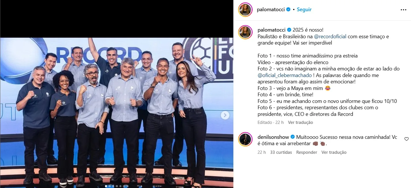 “2025 é nosso! Paulistão e Brasileirão na Record com esse timaço e grande equipe! Vai ser imperdível. Vocês não imaginam a minha emoção de estar ao lado do Cleber Machado! As palavras dele quando me apresentou foram algo assim de emocionar!”, escreveu Paloma Tocci, no Instagram.