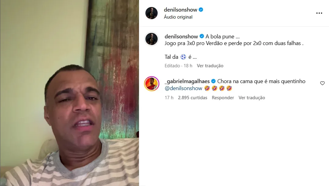 “Futebol nunca teve justiça, né?! É aquele joguinho para 3 a 0 ou 4 a 0. Só que quem não faz, toma! Jogo grande, clássico… o Corinthians fez dois gols em duas falhas. A segunda do Weverton e o primeiro (gol) do Garro na (falha) do Caio Paulista. O resto… é a tal da bola.”, disse Denílson, em vídeo no Instagram.