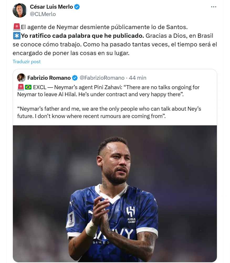 “Não há conversas em andamento para Neymar deixar o Al Hilal. Ele está sob contrato e muito feliz lá. O pai do Neymar e eu somos as únicas pessoas que podemos falar sobre o futuro do Ney. Não sei de onde vêm os rumores recentes.”, externou Zahavi, ao jornalista Fabrizio Romano.