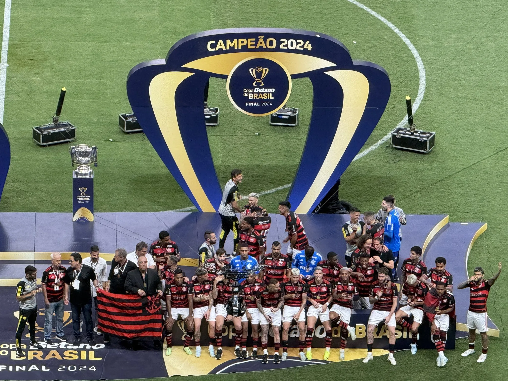 Elenco do Flamengo com a taça de campeão da Copa do Brasil (X oficial Copa do Brasil)
