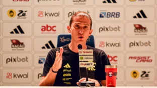 Filipe Luís durante coletiva em jogo do Flamengo (Paula Reis - Divulgação)