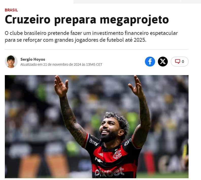 O Cruzeiro ganhou destaque no jornal AS pelo projeto que busca recolocar o clube no topo do futebol brasileiro. Finalista da Sul-Americana, a equipe de Fernando Diniz busca conquistar o primeiro título de peso com Pedro Lourenço à frente da SAF. Como grandes reforços podem chegar ao elenco em 2025, o “investimento financeiro espetacular” foi citado pelo diário espanhol.