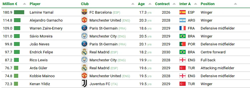 Além de ser o defensor com maior valor de mercado, Lucas Beraldo aparece como o 11º jogador sub-21 mais valorizado, atrás apenas de Lamine Yamal, do Barcelona, Savinho, do Manchester City, e a dupla Endrick e Arda Güler, do Real Madrid.