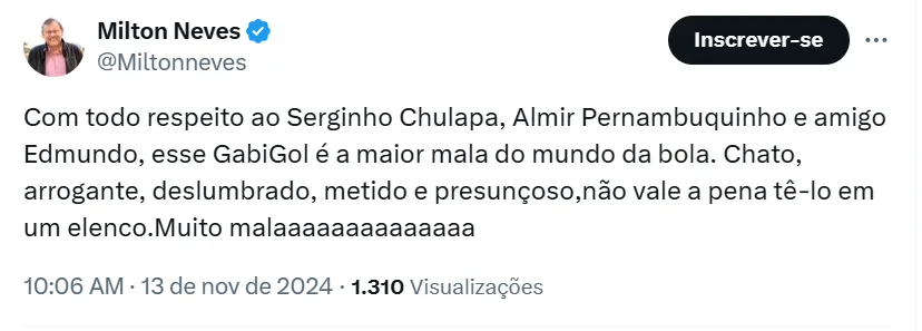 “Com todo respeito ao Serginho Chulapa, Almir Pernambuquinho e amigo Edmundo, esse Gabigol é a maior mala do mundo da bola. Chato, arrogante, deslumbrado, metido e presunçoso, não vale a pena tê-lo em um elenco. Muito malaaaaaaaaaaaaaa”, escreveu Milton Neves, na plataforma X.
