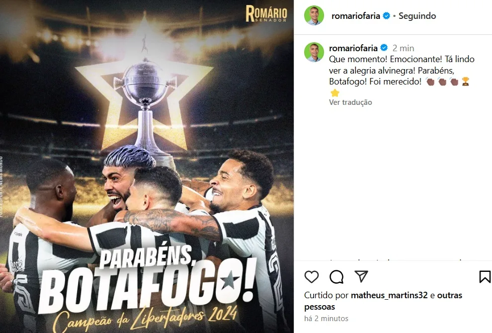 Romário, mesmo sem uma ligação direta, demonstrou felicidade após o título do Botafogo na Libertadores. Reagindo ao triunfo heroico por 3 a 1 do clube carioca sobre o Atlético-MG, o ex-jogador exaltou os festejos pela conquista inédita. Por fim, houve uma sinalização de que o campeão do torneio foi totalmente justo.