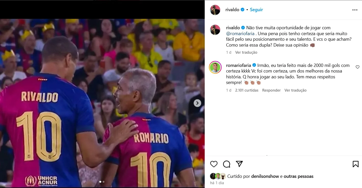 “Não tive muita oportunidade de jogar com Romário. Uma pena, pois tenho certeza que seria muito fácil pelo seu posicionamento e seu talento. E vocês, o que acham? Como seria essa dupla?”, escreveu Rivaldo, em mensagem no Instagram.