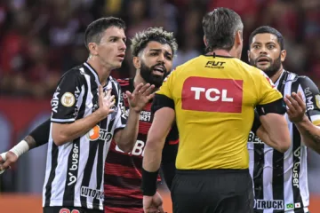 Hulk, do Atlético-MG, e Gabigol, do Flamengo, discutem com o árbitro Raphael Claus durante partida do Brasileirão 2022. (Pedro Vilela/Getty Images)