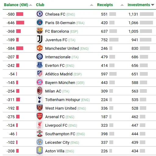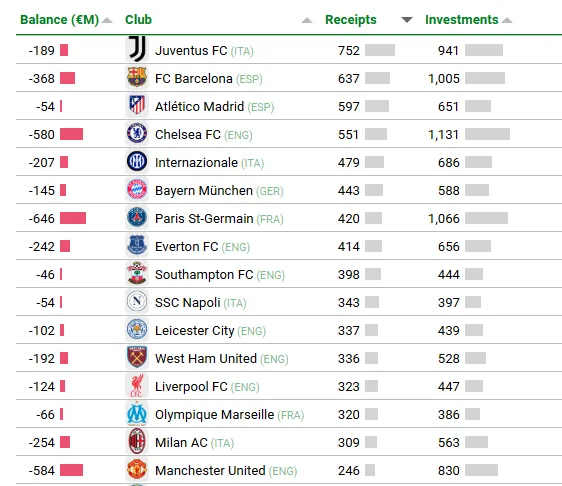 A equipe inglesa investiu 1,1 bilhão de euros (cerca de R$ 7,15 bilhões) em compras de jogadores, com 551 milhões de euros (R$ 3,4 bilhões) em saídas de atletas, um saldo negativo de 580 milhões de euros (R$ 3,6 bilhões). Já o Barcelona gastou 1 bilhão de euros (R$ 6,3 bilhões), com vendas no total de 637 bilhões de euros (R$ 4 bilhões), uma diferença de 368 milhões de euros (R$ 2,3 bilhões).