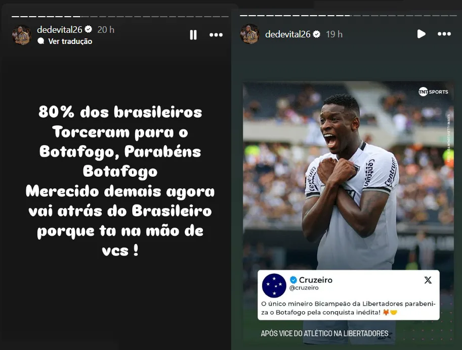 “80% dos brasileiros torceram para o Botafogo. Parabéns, Botafogo. Merecido demais. Agora, vai atrás do Brasileiro porque está na mão de vocês.”, escreveu Dedé, no Instagram.