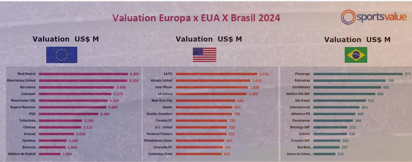 Esse ponto é outro que ajuda o Flamengo a liderar o ranking no Brasil. Em 2024 a equipe teve uma avaliação apenas da sua marca de R$ 2 bilhões.