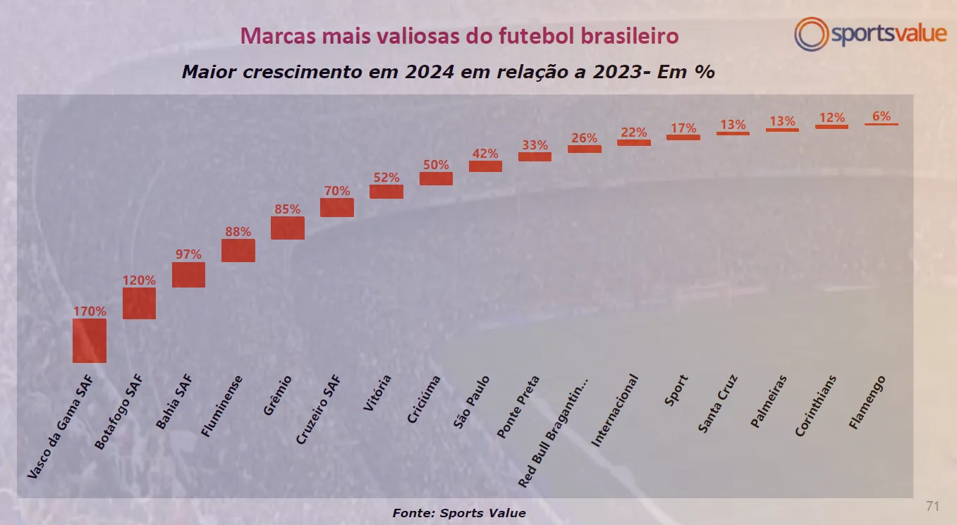 Um fato curioso é que os três times que lideram o ranking de valuation no Brasil não estão entre os que tiveram maior valorização da sua marca nos últimos anos. Pelo contrário, ao analisar o cenário de 2023 para 2024, os três foram o que tiveram o menor percentual de crescimento.