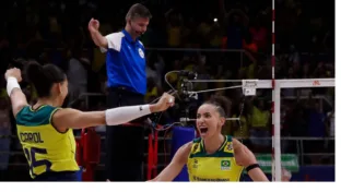 Jogadoras do Brasil comemoram vitória sobre os Estados Unidos no final da partida da Liga das Nações Feminina de Voleibol 2024. (Bruna Prado/AP)