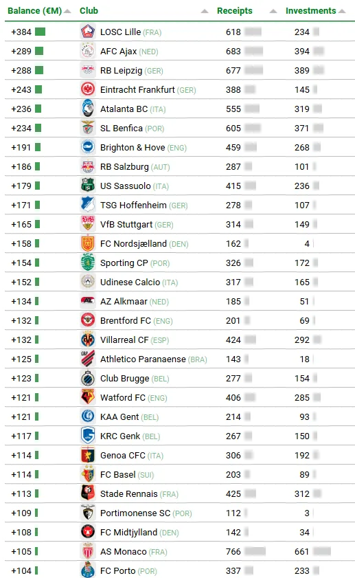 O balanço mostra um resultado positivo de 384 milhões de euros (R$ 2,429 bilhões) de lucro. Em seguida, aparecem o Ajax (€ 289 milhões / R$ 1,828 bilhão), RB Leipzig (€ 288 milhões / R$ 1,822 bilhão), Eintracht Frankfurt (€ 243 milhões / R$ 1,537 bilhão) e Atalanta (€ 236 milhão / R$ 1,4932 bilhão), fechando o Top-5.