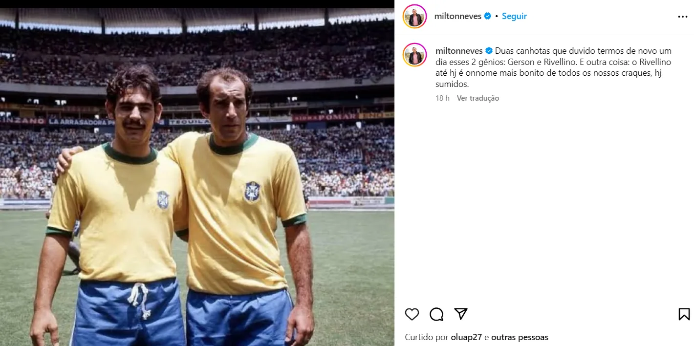 “Duas canhotas que duvido termos de novo um dia esses dois gênios: Gerson e Rivellino. E outra coisa: o Rivellino até hoje é nome mais bonito de todos os nossos craques, hoje sumidos.”, escreveu Milton Neves, em mensagem no Instagram.