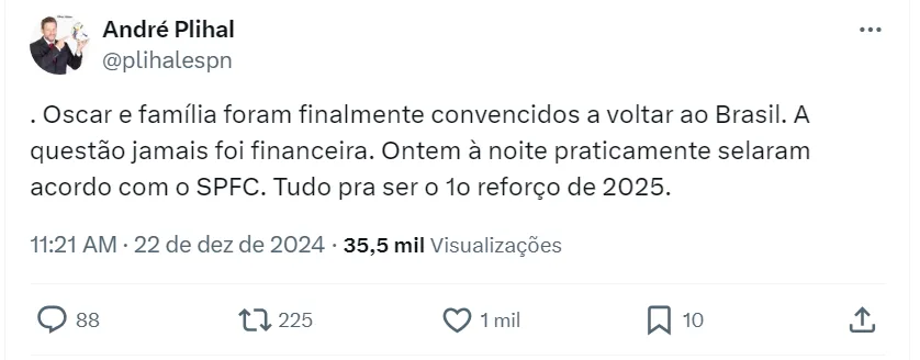 “Oscar e família foram finalmente convencidos a voltar ao Brasil. A questão jamais foi financeira. Ontem à noite praticamente selaram acordo com o SPFC. Tudo pra ser o primeiro reforço de 2025.”, informou Plihal, em postagem na plataforma X.