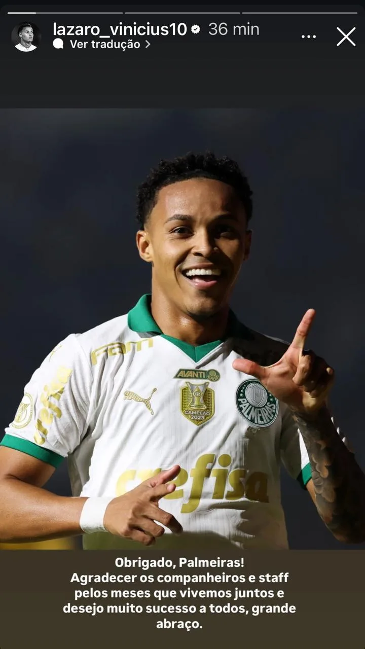 “Obrigado, Palmeiras! Agradecer aos companheiros e ao estafe pelos meses que vivemos juntos e desejo muito sucesso a todos. Grande abraço”, escreveu Lázaro, ao se despedir do time alviverde nas redes sociais.