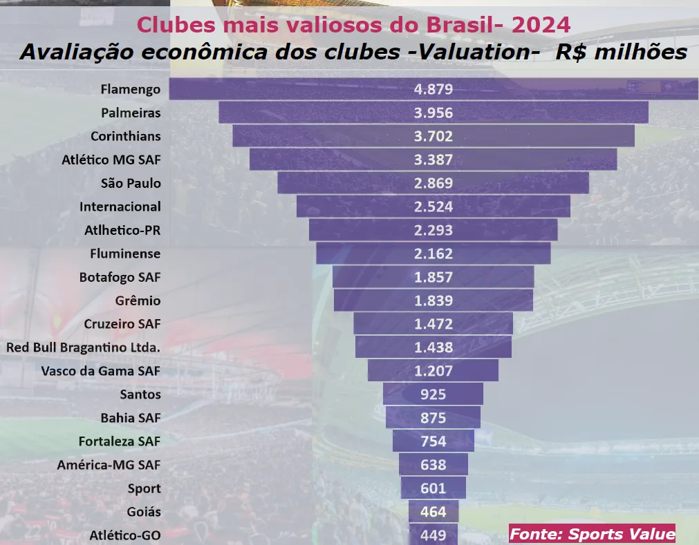 Anualmente a empresa Sports Value, especialista em marketing esportivo, faz um análise financeira dos principais times do Brasil mapeando diversos pontos, como o valor econômico das equipes brasileiras. Em 2024, o estudo apontou um crescimento de 24% em relação 2023, com um valor superior a R$ 41 bilhões, considerando os 30 principais clubes.