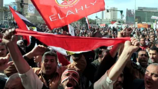 Manifestantes egípcios levantam bandeira do Al Ahly, que perdeu dezenas de torcedores durante confrontos em uma partida em Port Said. (AP / Amr Nabil)