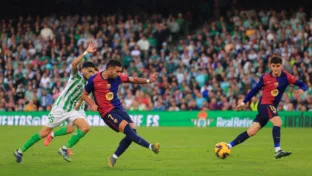 O Barcelona goleou o Real Betis por 5 a 1, no estádio Lluís Companys, nesta quarta-feira (15). Com o resultado, a equipe da Catalunha garantiu vaga na fase quartas de final da Copa do Rei. Gavi abriu o placar aos três minutos do primeiro tempo e Koundé dobrou a vantagem aos 27.