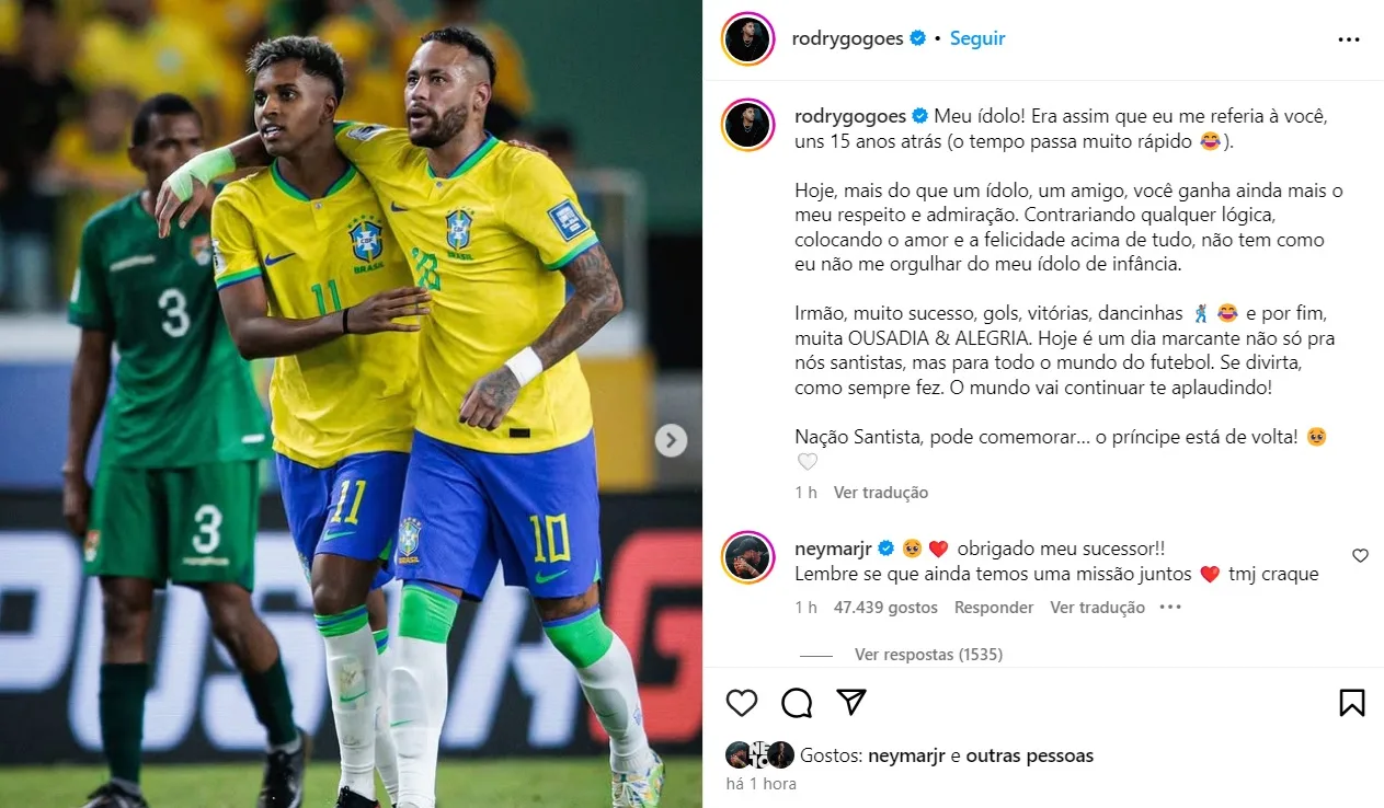 “Irmão, muito sucesso, gols, vitórias, dancinhas e por fim muita OUSADIA & ALEGRIA. Hoje é um dia marcante não só para nós santistas, mas para todo o mundo do futebol. Se divirta, como sempre fez. O mundo vai continuar te aplaudindo.”, escreveu Rodrygo, em mensagem no Instagram.