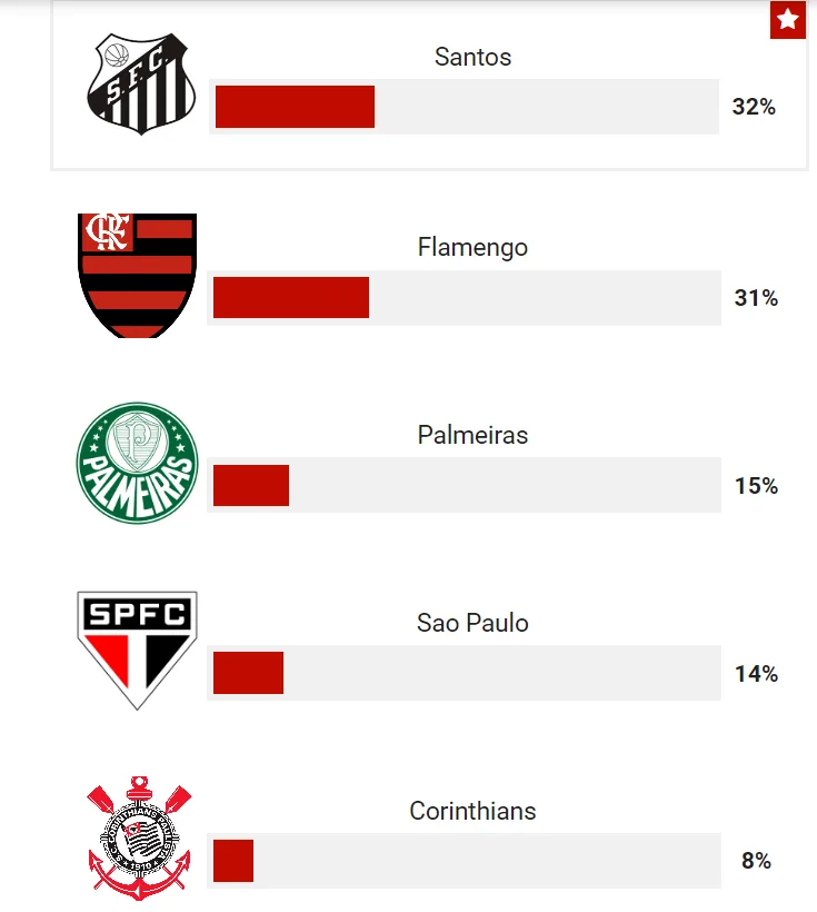 Em enquete recente, o Peixe foi eleito como o número 1 do Brasil pelo jornal “Marca”, um dos mais importantes da Espanha. O clube do Rei Pelé teve 32% dos votos e foi seguido por Flamengo (31%), Palmeiras (15%), São Paulo (14%) e Corinthians (8%); confira: