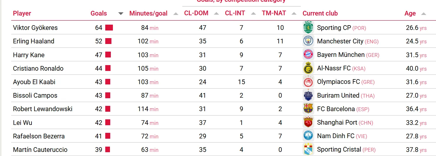 - CL-DOM – gols marcados em ligas nacionais