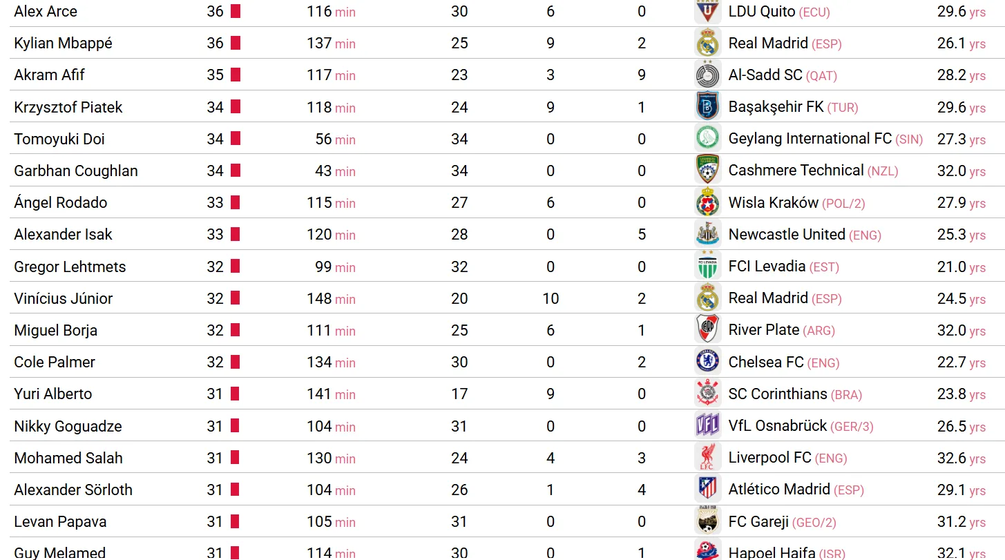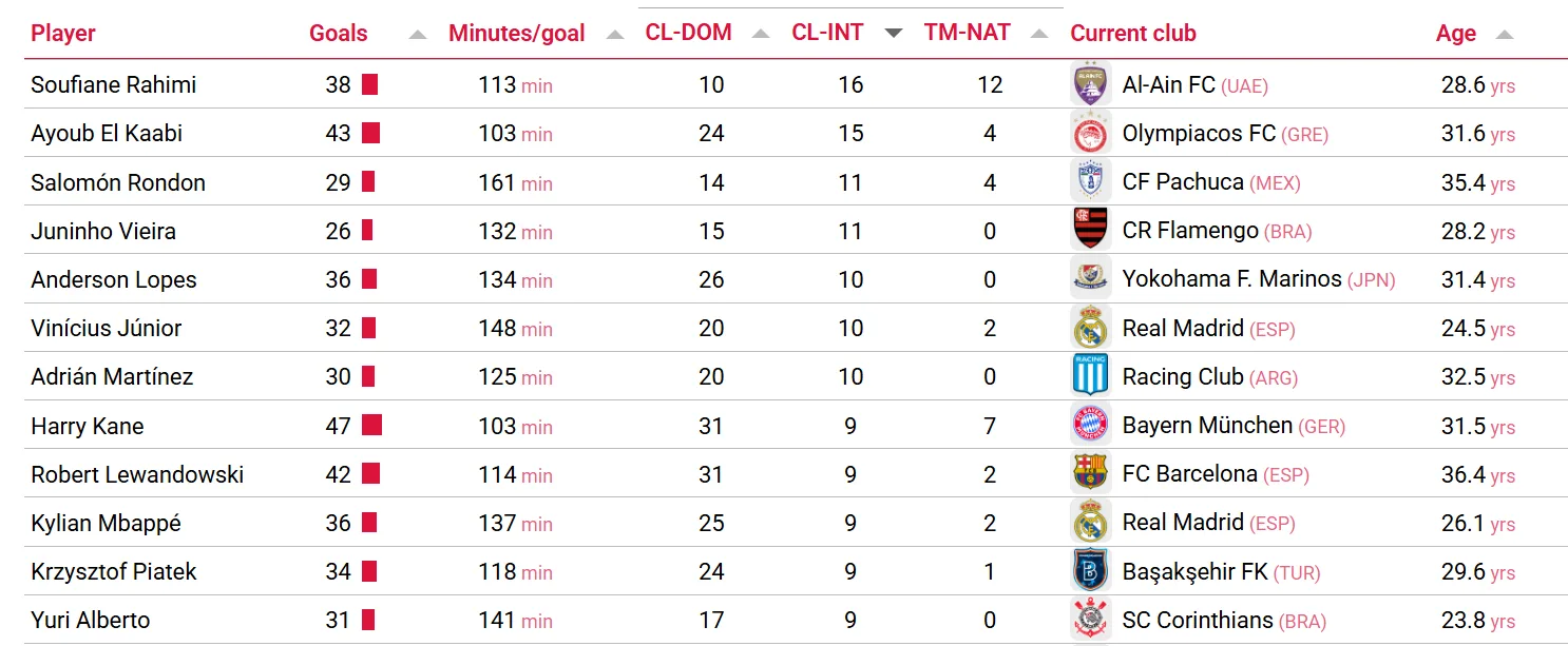 Além disso, Vini Jr foi superado por outros brasileiros no posto de maiores goleadores mundiais. Rafaelson Bezerra, do Narn Dinh, balançou as redes em 41 oportunidades, entrando no Top-10, enquanto Anderson Lopes, do Yokohama F Marinos, teve 36 gols.