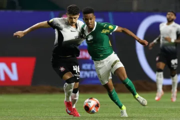 Estêvão disputa bola com Hugo no Dérbi pelo Paulistão (Cesar Greco - Ag. Palmeiras - Divulgação)