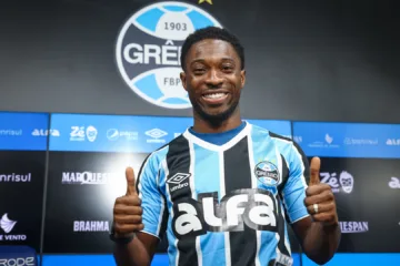 Francis Amuzu, em sua apresentação pelo Grêmio (LUCAS UEBEL/GREMIO FBPA)