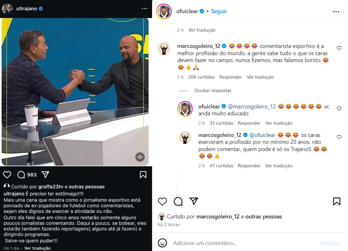 Marcos, após José Trajano reprovar o número de ex-jogadores atuando como comentaristas, alfinetou o discurso veiculado no Instagram. Em postagem no Instagram, o experiente profissional projetou que” em cinco anos restarão somente alguns poucos jornalistas comentando”. Neste cenário, a contratação de Felipe Melo pela Globo motivou o desabafo.