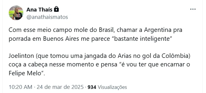 “Com esse meio campo mole do Brasil, chamar a Argentina pra porrada em Buenos Aires me parece ‘bastante inteligente’”, ironizou a comentarista da TV Globo, nas redes sociais.