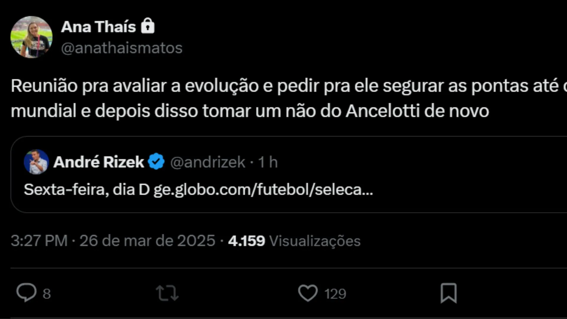 No “X”, ela compartilhou uma informação de Rizek sobre uma reunião decisiva agendada para a sexta (28), e disse que o atual treinador será mantido no cargo até a disputa do Mundial, permanecendo assim na Data Fifa de junho, mas disse apostar que a medida adotada pela CBF em esperar Ancelotti será mais uma nova frustração.