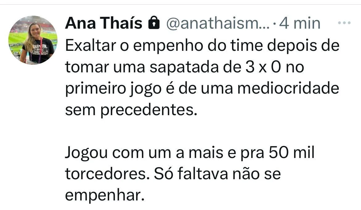 “Exaltar o empenho do time depois de tomar uma sapatada de 3 x 0 no primeiro jogo é de uma mediocridade sem precedentes. Jogou com um a mais e pra 50 mil torcedores. Só faltava não se empenhar”, criticou a comentarista da TV Globo, nas redes sociais.