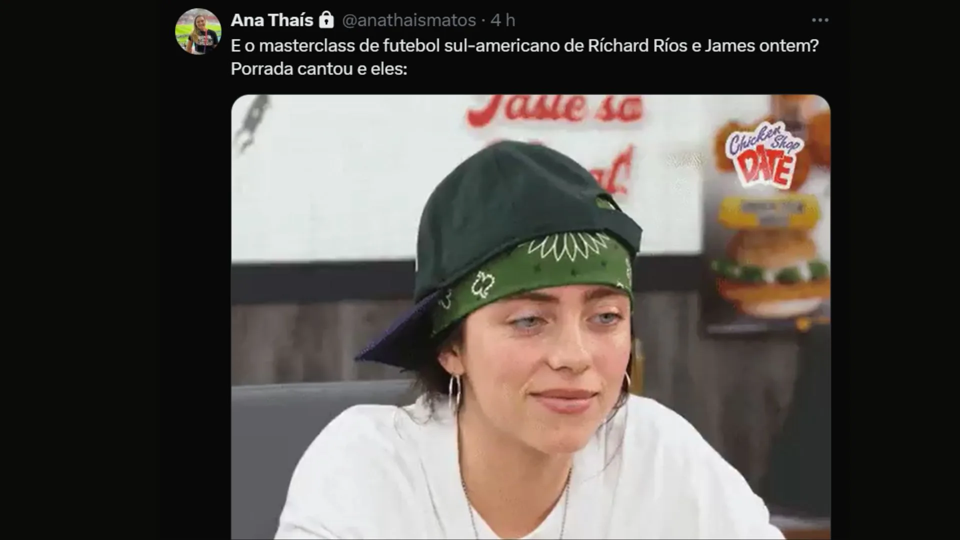 “E o masterclass de futebol sul-americano de Richard Ríos e James ontem? Porrada cantou e eles”, avaliou a comentarista.