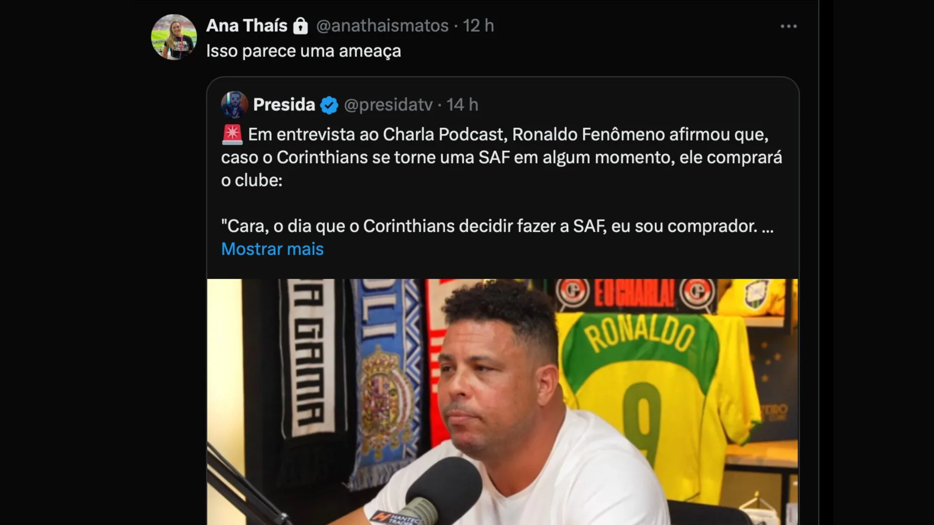 Ana Thaís, jornalista do Grupo Globo, utilizou as redes sociais para comentar o posicionamento de Ronaldo Fenômeno, que disse ter desejo de comprar o Corinthians em um futuro, caso o alvinegro migre para SAF. Em post no “X”, ela classificou que as falas do ex-atacante soaram como ‘ameaça’.