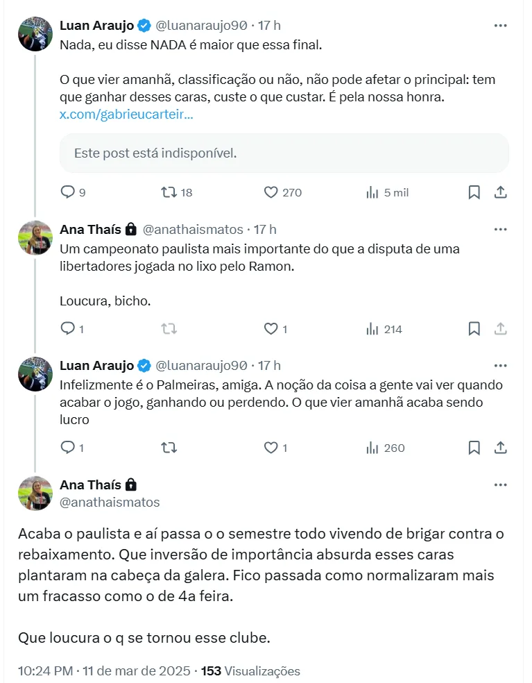 “Um Campeonato Paulista mais importante do que a disputa de uma Libertadores jogada no lixo pelo Ramon. Loucura, bicho.”, escreveu Ana Thaís, em mensagem na plataforma X.