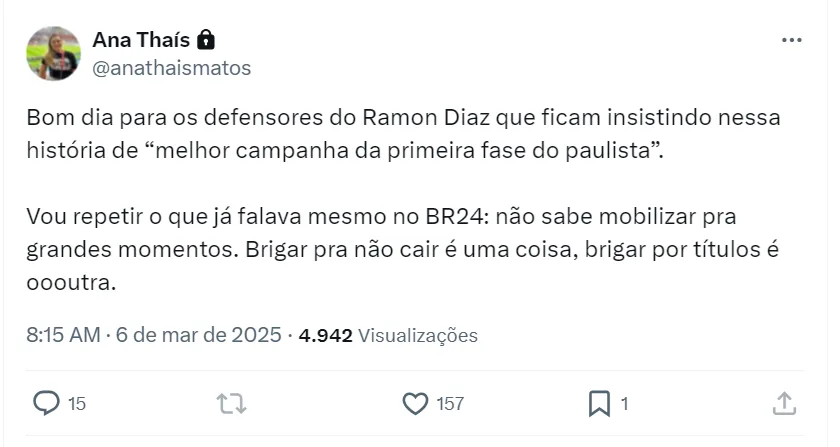 “Bom dia para os defensores do Ramon Diaz que ficam insistindo nessa história de ‘melhor campanha da primeira fase do paulista’.”, escreveu Ana Thaís, na plataforma X.