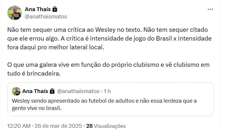 “Não tem sequer uma crítica ao Wesley no texto. Não tem sequer citado que ele errou algo. A crítica é intensidade de jogo do Brasil x intensidade fora daqui pro melhor lateral local. O que uma galera vive em função do próprio clubismo e vê clubismo em tudo é brincadeira.”, acrescentou.