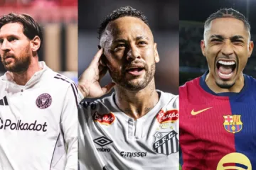Neymar, Messi e Raphinha elogiam jovens do futebol mundial. Foto: Divulgação/Santos, Barcelona e Inter Miami