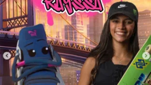 A skatista Rayssa Leal interpreta a voz de um tênis rosa; a atleta foi convocada pela Confederação Brasileira de Skateboarding