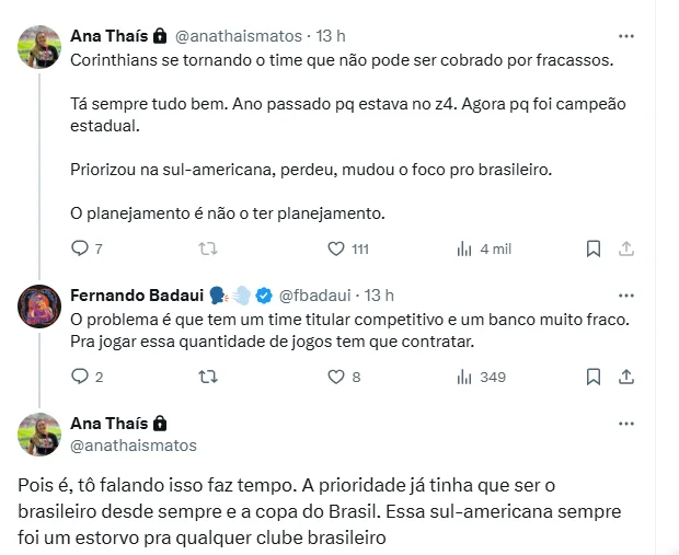 “Corinthians se tornando o time que não pode ser cobrado por fracassos. Tá sempre tudo bem. Ano passado porque estava no Z-4. Agora porque foi campeão estadual. Priorizou na Sul-Americana, perdeu, mudou o foco pro Brasileiro. O planejamento é não ter planejamento.”, escreveu Ana Thaís, na plataforma X.