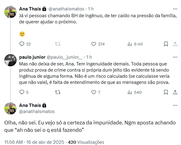 “Já vi pessoas chamando Bruno Henrique de ingênuo, de ter caído na pressão da família, de querer ajudar o próximo.”, escreveu Ana Thaís, compartilhando um emoji de discordância.