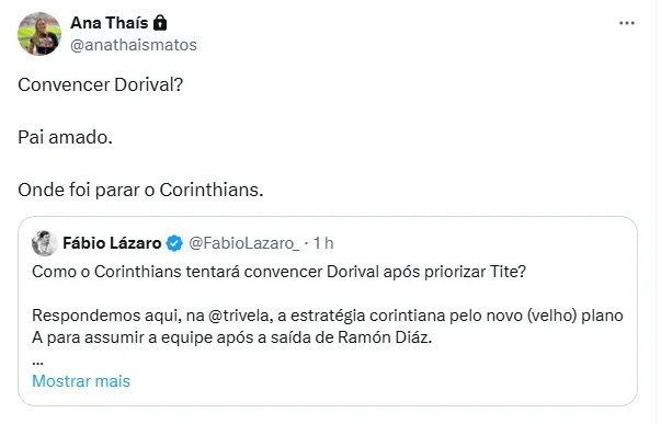“Convencer Dorival? Pai amado. Onde foi parar o Corinthians.”, reagiu Ana Thaís, em mensagem na plataforma X.