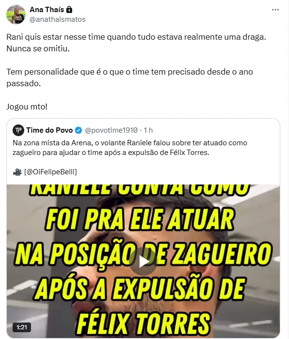 “Rani quis estar nesse time quando tudo estava realmente uma draga. Nunca se omitiu.”, escreveu Ana Thaís, em mensagem na plataforma X.