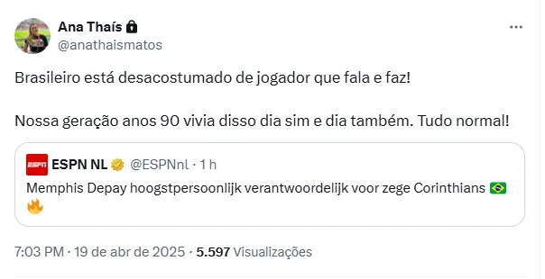 Ana Thaís Matos fez questão de exaltar Memphis Depay após Corinthians x Sport. Antes da partida no Brasileirão, o camisa 10 deixou claro que o Timão precisava “sofrer menos” e o cenário de “jogar sempre com a arma na cabeça” era inaceitável. Neste cenário, como o holandês decidiu o confronto na Neo Química Arena ao anotar dois gols, o estilo destemido presente nos anos 90 ganhou elogios.