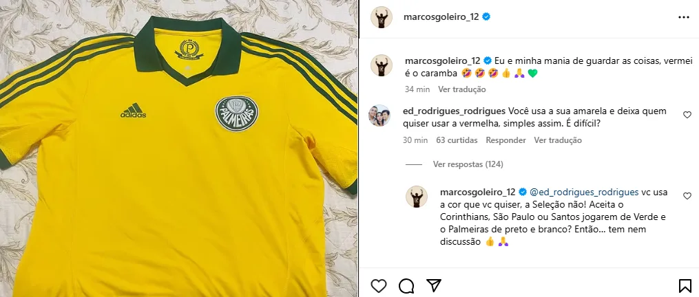 “Você usa a cor que quiser, a seleção não! Aceita o Corinthians, São Paulo ou Santos jogarem de verde e o Palmeiras de preto e branco? Então… tem nem discussão.”, escreveu Marcos, em comentário no Instagram.