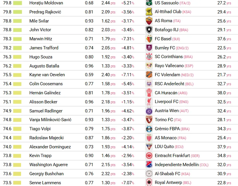 Além disso, para entrar no ranking os goleiros precisam ter um mínimo de 20 partidas realizadas nos últimos 365 dias e tendo um desempenho positivo no critério DEV citado acima.