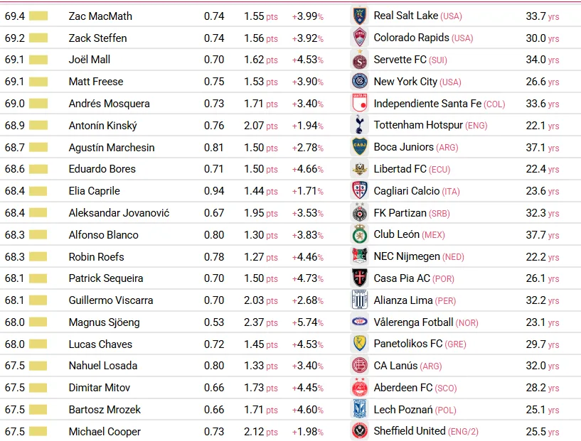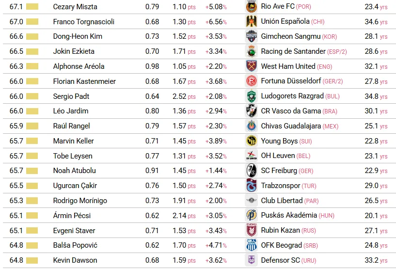 O atleta mais jovem da lista é Ármin Pécsi, do Púskas Akadémia da Hungria, com 20 anos enquanto o mais velho é Remko Pasveer, do Ajax, com 41 anos.